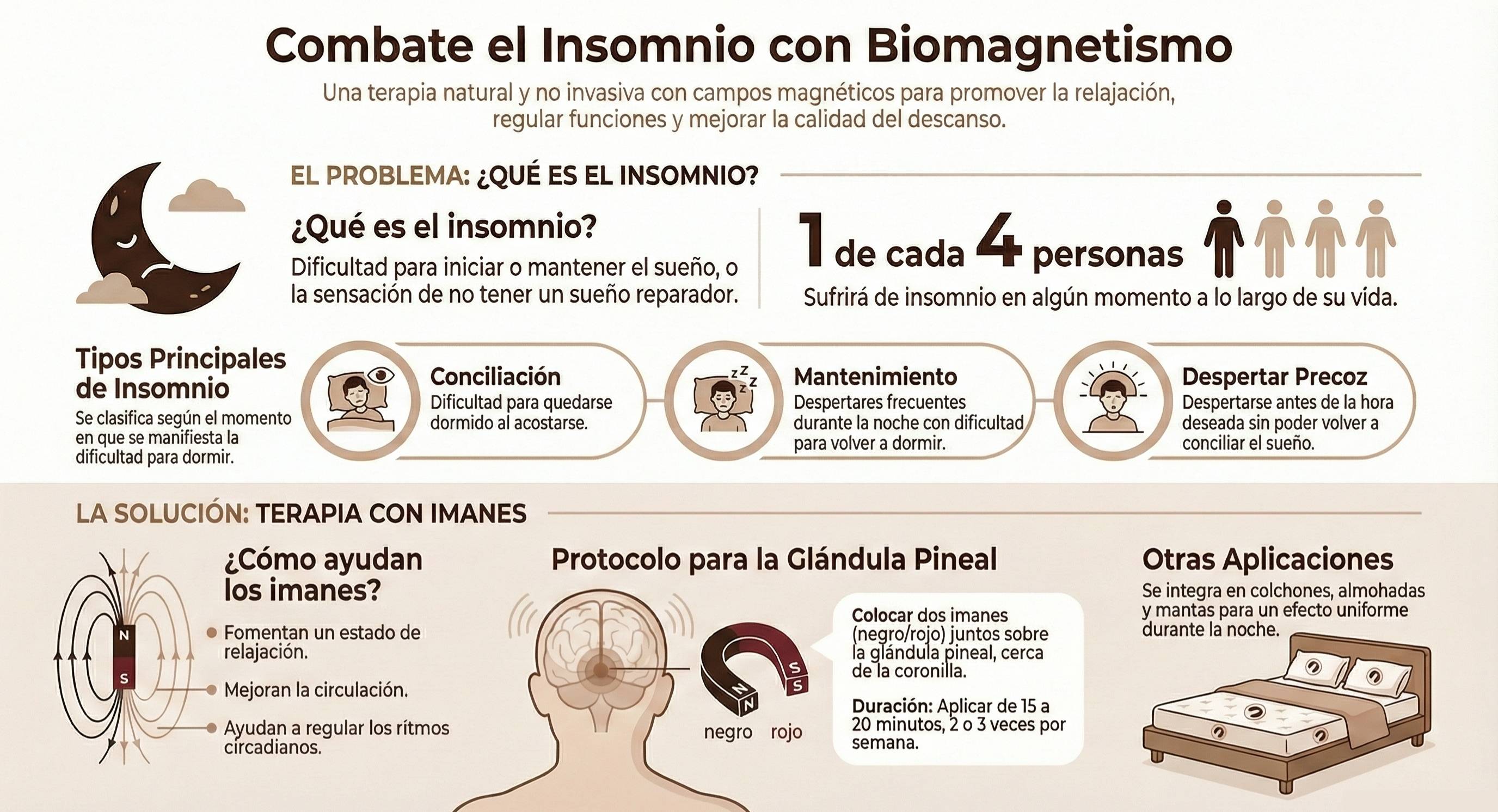 Este enfoque integral favorece estados de relajación sostenida, reduce la hiperactivación mental y física acumulada durante el día, y prepara al cuerpo para transitar de manera natural hacia las fases profundas del sueño. Al no ser invasiva, la terapia de imanes puede integrarse de forma complementaria a hábitos saludables de descanso, potenciando sus efectos sin generar dependencia ni efectos secundarios.